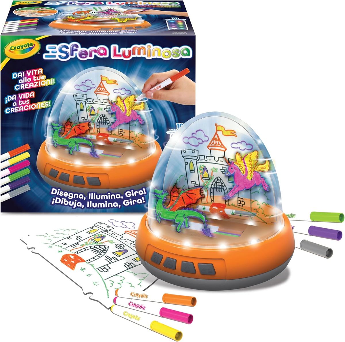 Воображение расцветает яркими красками, создавая фантастические рисунки, которые светятся и вращаются! Рисуйте на куполе и внутренней панели, создавая потрясающие двухуровневые эффекты. Три разные скорости вращения и десять различных цветов с множеством режимов освещения делают эту игрушку удивительно простой в использовании, предлагая так много возможностей! После установки батареек основание светящегося купола готово к использованию. Просто установите внутренний и внешний купола, которые вставляются на место. Затем дети могут рисовать от руки прилагаемыми гелевыми ручками и выключить свет! При нажатии кнопки купол вращается с тремя разными скоростями: медленной, обычной или быстрой. Перемещая ползунок функции подсветки, вы можете подсветить внутреннюю панель, внешний купол, оба или их комбинацию, создавая иллюзию мигающей световой анимации. Две поверхности для рисования можно протереть небольшим количеством воды и тряпкой, что позволяет творить и начинать заново бесконечно. После завершения рисования ручки можно хранить в двух отсеках на основании светящегося купола.